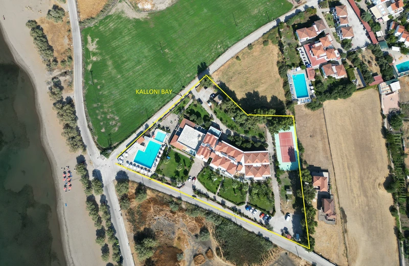 Plot of land outside the settlement of Skala Kallonis, with a total area of 10,033.33 sq.m. The three-star hotel unit has a capacity of 53 rooms – 101 beds, two swimming pools, a pool bar, indoor and outdoor restaurant areas, a studio for the manager, a tennis court, and a landscaped surrounding area.
